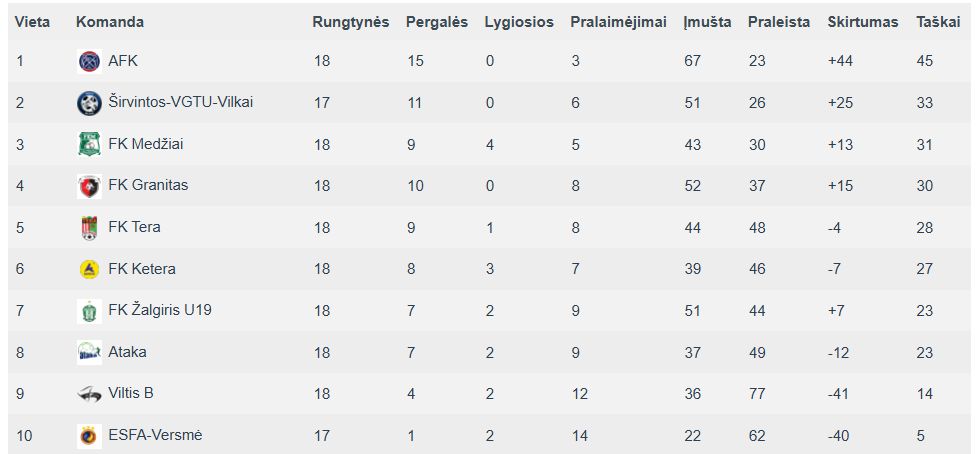 Po abu sykius nugalėję savo pagrindinius varžovus VGTU-Vilkus ir Medžius, AFK'ai rudens rate tvirtai kontroliavo padėtį. O čempionais tapo „išeiginių“ metu. Spalio 15 dieną atidėtose rungtynėse Tera 4:3 nugalėjo VGTU-Vilkus ir tuomet tapo aišku, kad širvintiškiai nebeturi net teorinių vilčių kovoti dėl titulo.