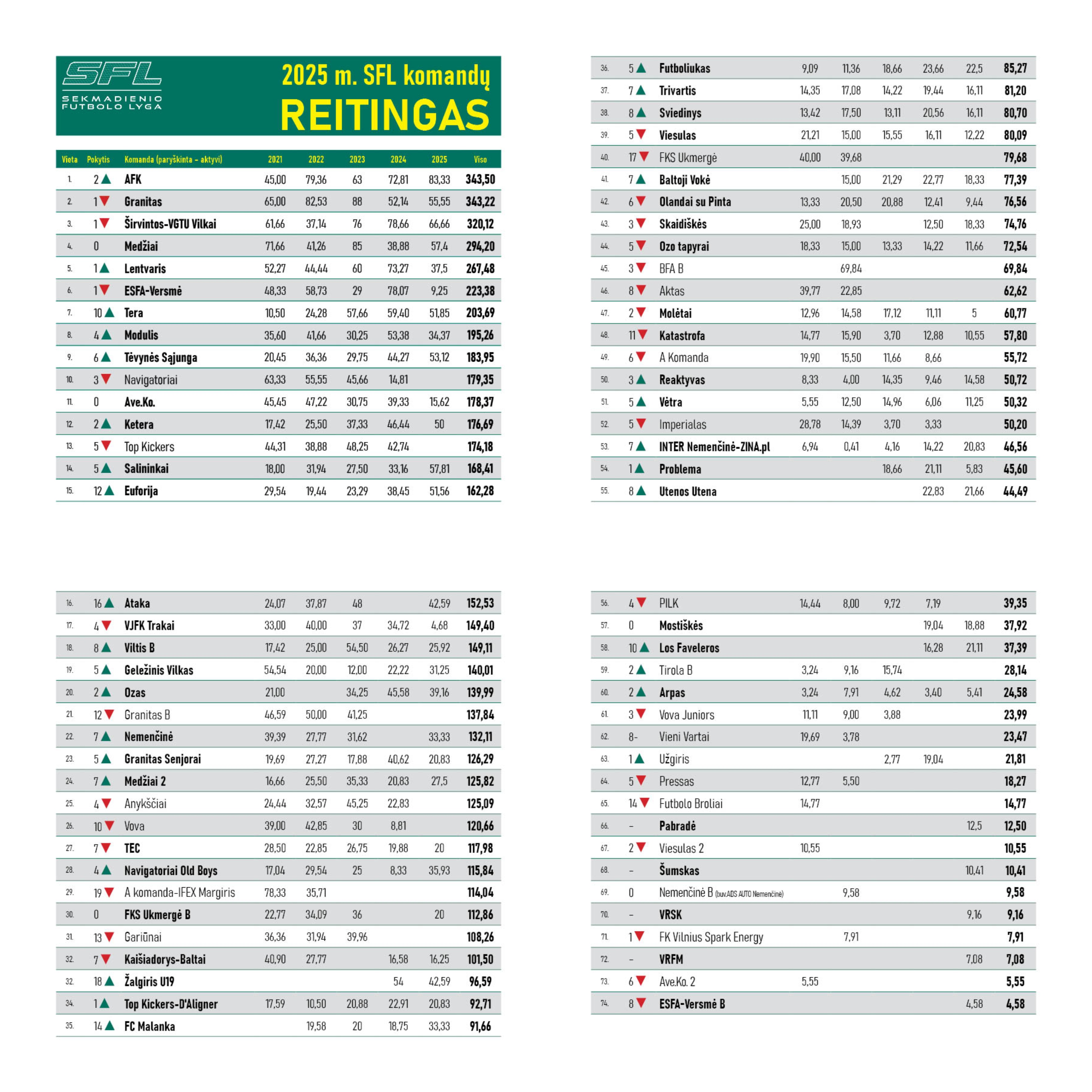 Ketvirtą poziciją komandų reitinge išsaugojo III lygoje bronzą iškovoję FK Medžiai (57,4 balo), tuo metu katastrofišką sezoną apturėjusi pernykštė III lygos nugalėtoja Elektrėnų ESFA-Versmė vietą Top 5-uke užleido FK Lentvaris kolektyvui. Pernai 78,07 balo surinkusi Elektrėnų ekipa šiais metais suskrebeno vos 9,25 balo (8-as prasčiausias rezultatas tarp visų aktyvių reitingo komandų), savų problemų turėjęs Lentvaris – 37,5. Atmetus 2020 metais surinktus balus (Elektrėnams – minus 60,08, o Lentvariui – minus 30,37), paaiškėjo, kad bendroje sumoje FK Lentvaris pasididino savo balų kraitį iki 267,48, o ESFA-Versmė susimažino iki 223,38.